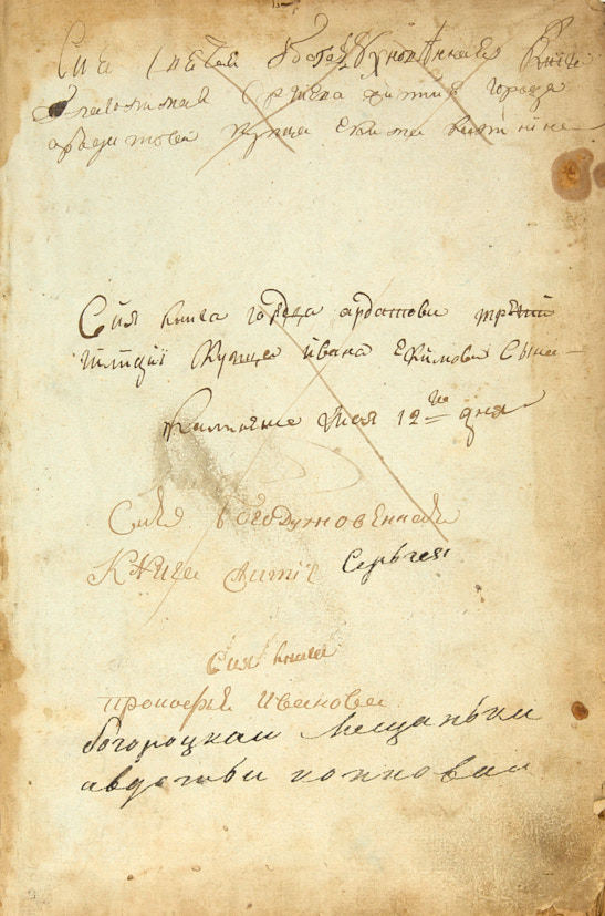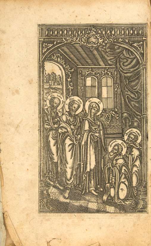 В цельнокожаном переплете эпохи с блинтовым тиснением. Утрата небольших фрагментов кожи с переплета, надрыв верхнего края корешка, владельческие надписи на форзацных листах (в том числе три надписи, принадлежащие купцам города Ардатова), следы жучка на первых листах, утраты фрагментов по нижнему краю гравюры, первых и последних листов. Небольшие загрязнения страниц. Утрата одного ненумерованного листа после л. 45 (возможно, пустой лист). Гравюра отделена. Ненумерованные листы с оглавлением подрезаны по краям.