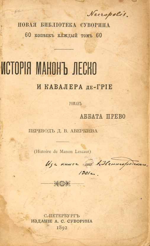 [Серия «Новая библиотека Суворина». Экземпляр из собрания А.В. Звенигородского]. История Манон Леско и кавалера де Грие Аббата А.Ф. Прево / перевод Д.В. Аверкиева. СПб.: Издание А.С. Суворина, 1892.
