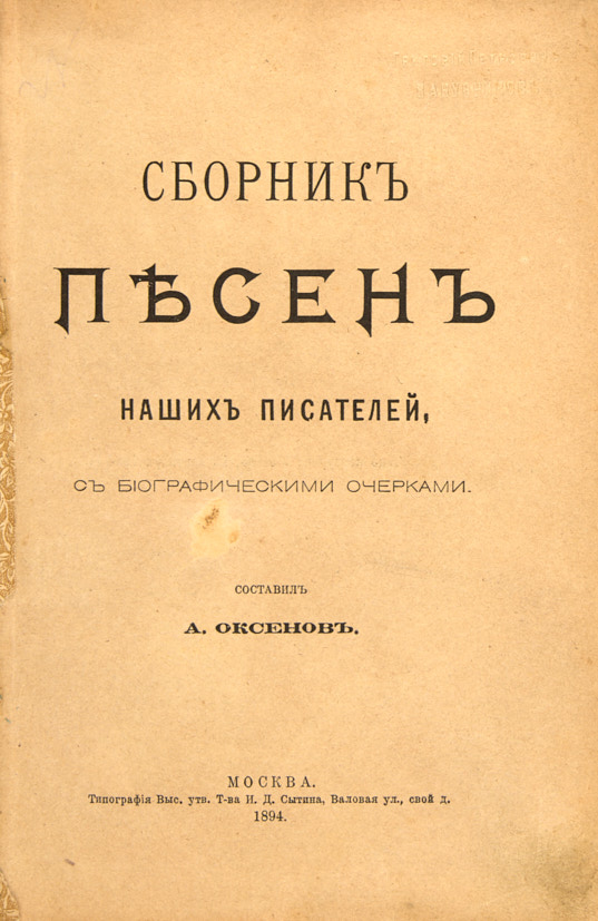 Оксенов, А. Сборник песен наших писателей, с биографическими очерками. М.: Тип. Выс. утв. Т-ва И.Д. Сытина, 1894.