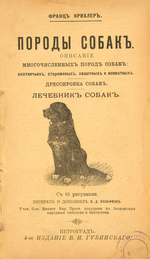Крихлер, Ф. Породы собак. Описание многочисленных пород собак: охотничьих, сторожевых, защитных и комнатных. Дрессировка собак. Лечебник собак. С 65 рисунками / перевёл и дополнил В.Д. Вольфсон. 4-е издание. Пг.: Издание В.И. Губинского, 1895.
