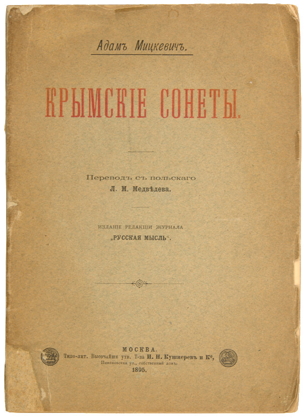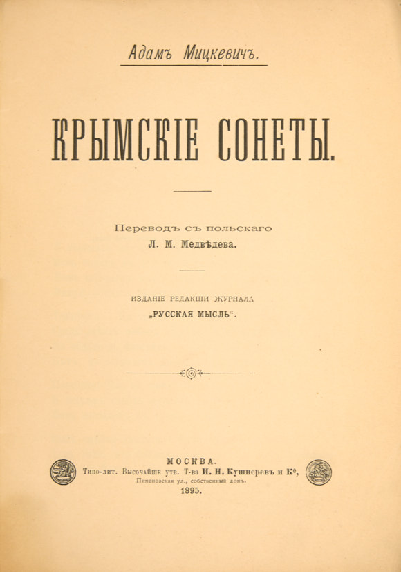 Мицкевич, А. Крымские сонеты / пер. с пол. Л.М. Медведева. М.: Изд. ред. журн. «Русская мысль», 1895.