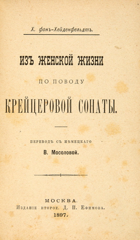 Фон-Хейденфельдт, Х. Из женской жизни по поводу Крейцеровой сонаты / перевод с немецкого В. Мосоловой. М.: Издание Д.П. Ефимова, 1897.