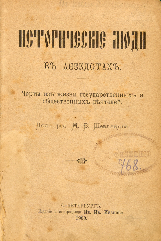 1. Исторические люди в анекдотах. Черты из жизни государственных и общественных деятелей / под ред. М.В. Шевлякова. СПб.: Изд. книгопродавца Ив. Ив. Иванова, 1900. [2], 390, IV с.