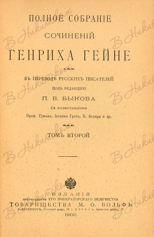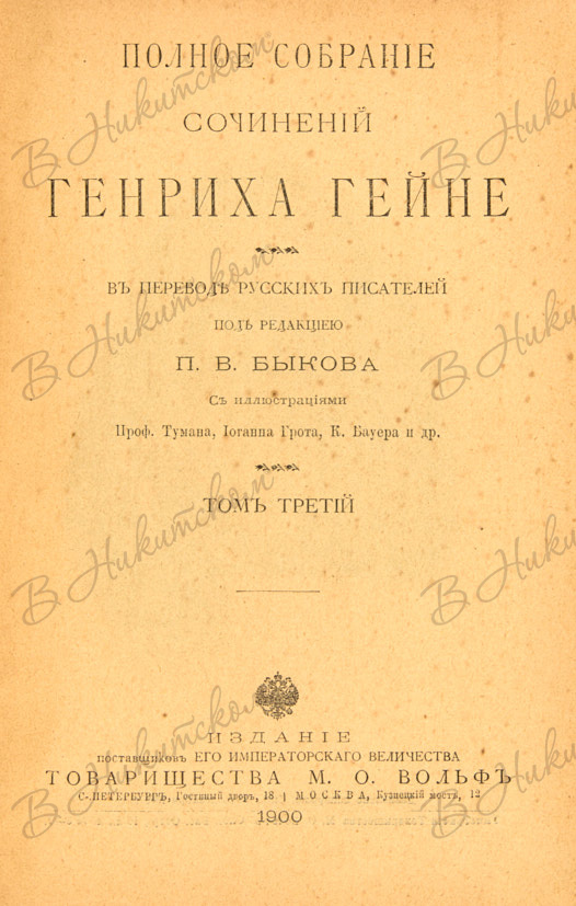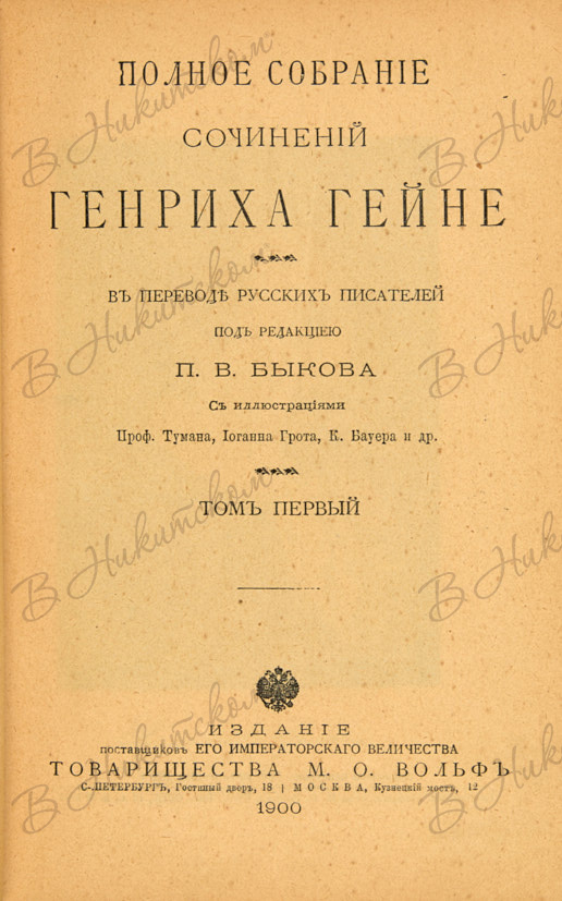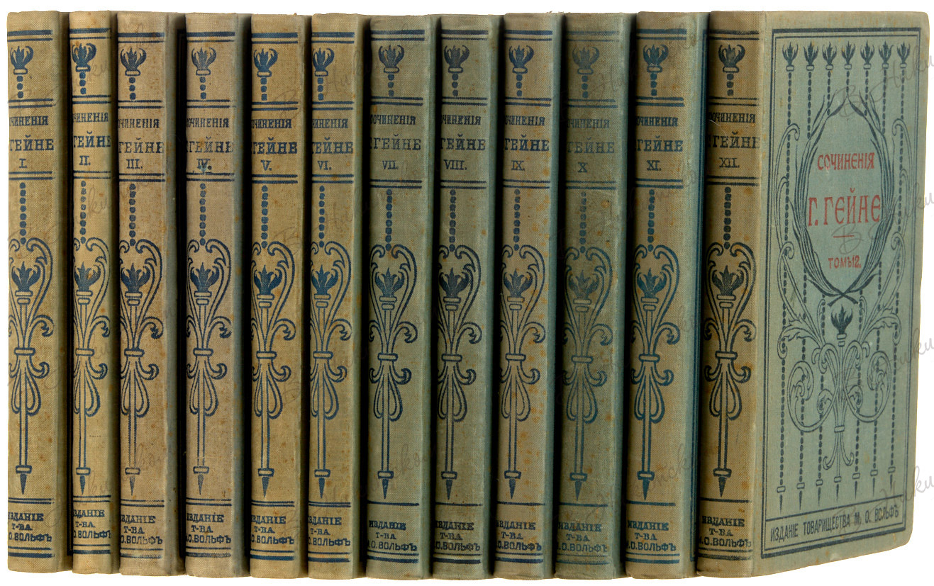 Гейне, Г. Полное собрание сочинений Генриха Гейне в переводе русских писателей / под ред. П.В. Быкова; с ил. проф. Тумана [и др.]. В 12 т. СПб.; М.: Т-во М. О. Вольф, 1900.