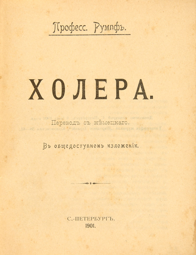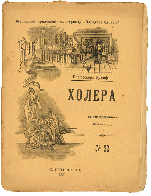 1. Проф. Румпф. Холера. Бесплатное приложение к журналу «Народное здравие». № 22. В общедоступном изложении. Спб., 1901. 47, [1] с. 18,3 х 14 см. В иллюстрированной издательской обложке.