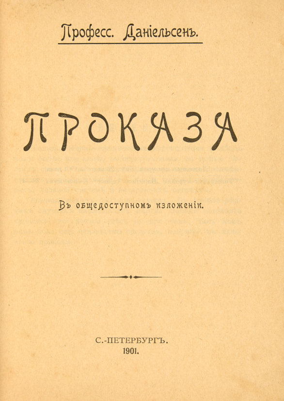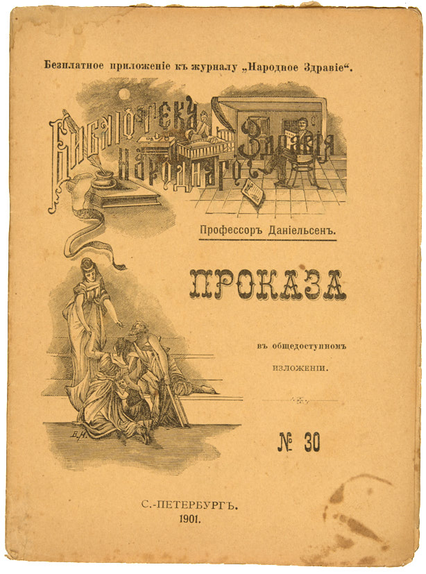 2. Проф. Даниельсен. Проказа / Бесплатное приложение к журналу «Народное здравие». № 30. В общедоступном изложении. СПб., 1901. 27, [1] с. 18,3 х 13,5 см. В иллюстрированной издательской обложке. Следы от залития, пятна. Экземпляр не разрезан.