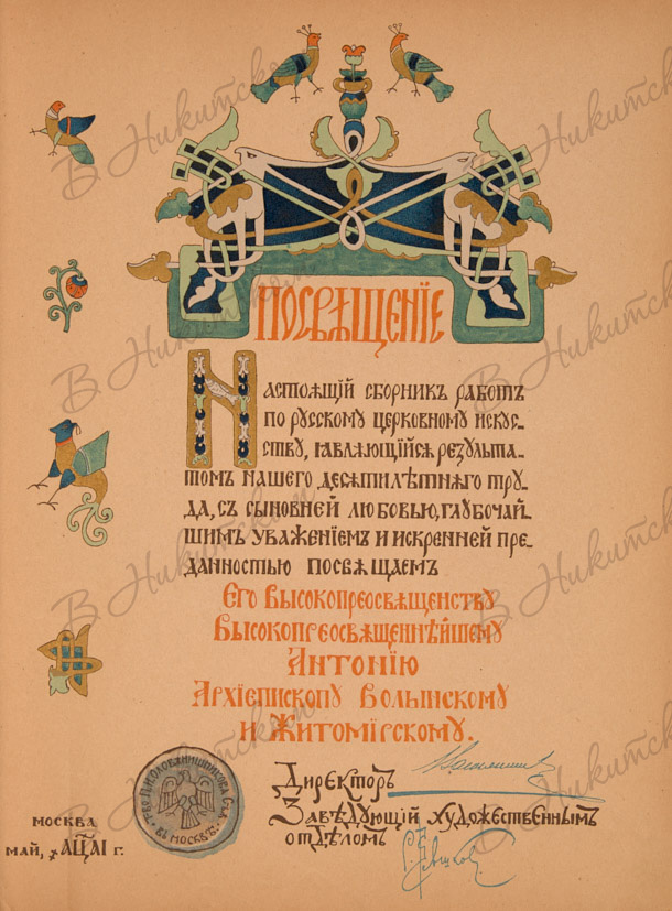 [25] с., 188 л. ил. 32 х 26 см. В издательском художественном переплете. Форзацы из орнаментированной бумаги с позолотой. Тройной торшонированный обрез. Незначительные загрязнения переплета, маленькие надрывы на верхнем и нижнем крае корешка. Сергей Иванович Вашков (1879-1914) - русский художник, архитектор, преподаватель, известный мастер церковного декоративно-прикладного искусства, представитель модерна. В 1900 г. Е.Г. Оловянишникова пригласила его к творческой работе в своем семейном предприятии, а год спустя назначила молодого художника заведующим художественным отделом Товарищества «П.И. Оловянишников и Сыновья».