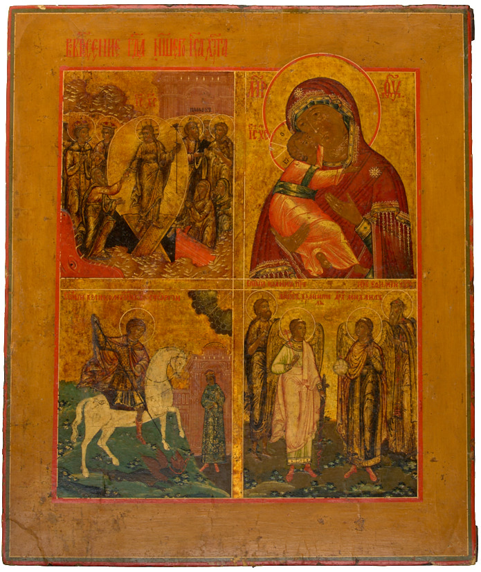 Икона четырехчастная: Воскресение Господне; Богоматерь Владимирская; Чудо Георгия о змие; Архангел Михаил, Ангел Хранитель, Иоанн Предтеча. Москва. Первая половина XIX в. Доска (кипарис), левкас, яичная темпера, 40,5×34×3 см.