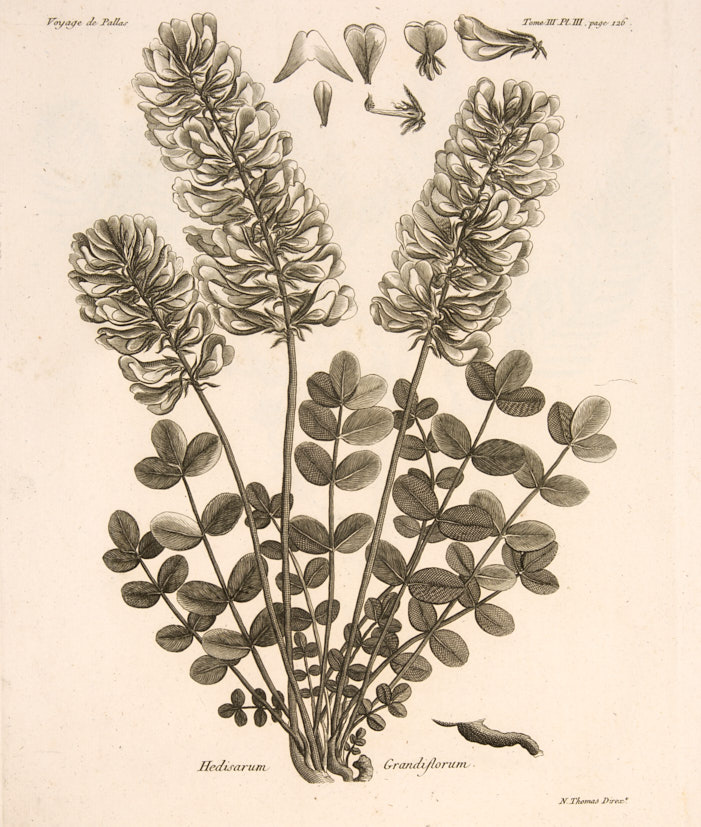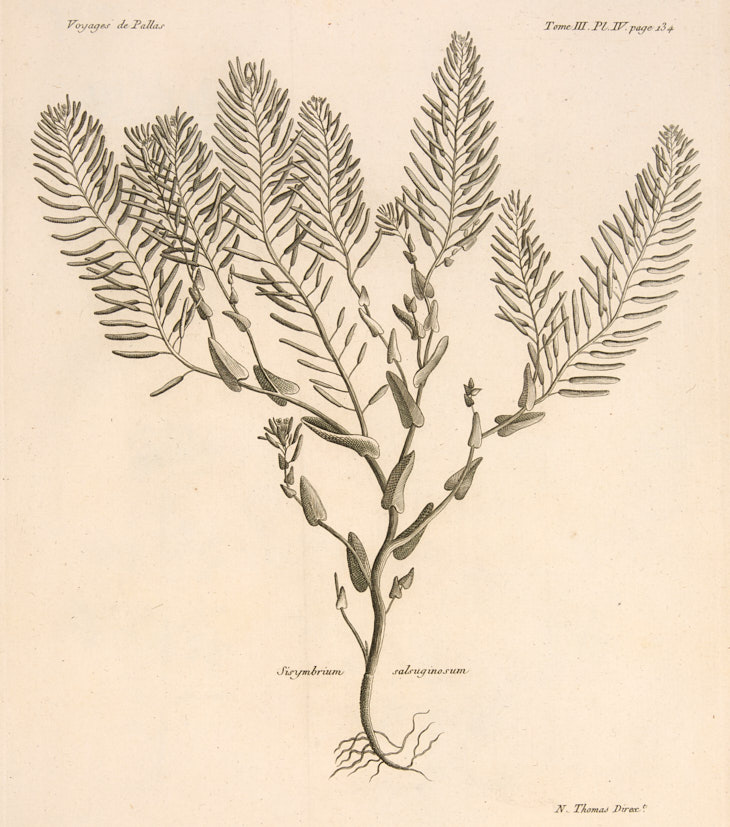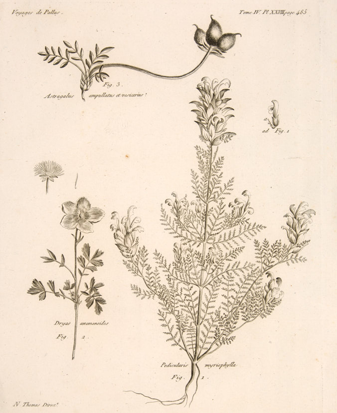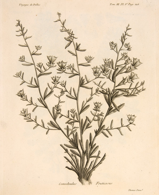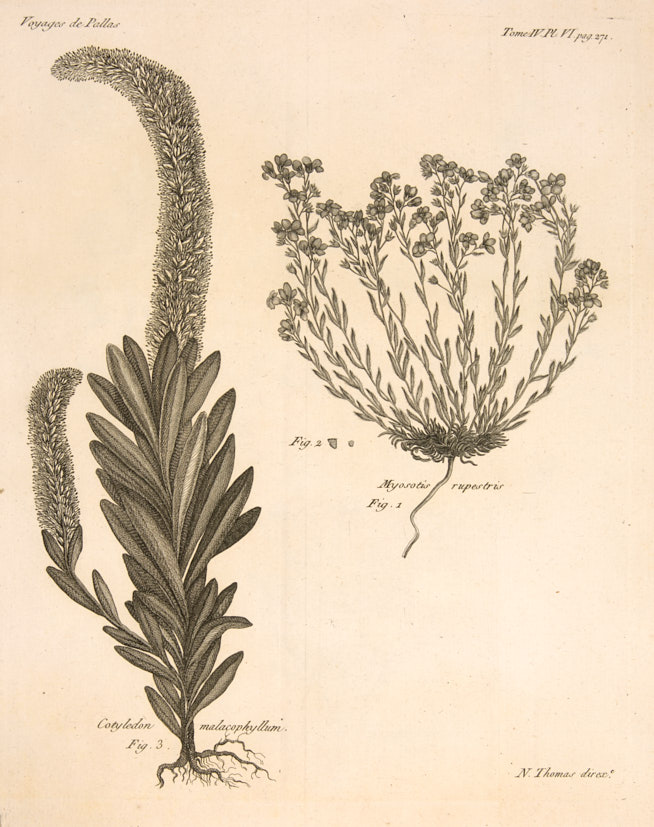 Томас Николас / Thomas Nicholas. Вьюнок, незабудка, сисимбрий. Лот из 5 листов из альбома «Путешествие по разным местам российского государства» созданных во время экспедиции (1768—1774), предпринятой исследователем Петером Симоном Палласом при поддержке Российской Академии наук. Резец, офорт, 35×24 см.