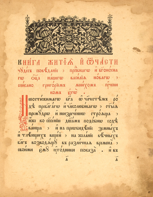 Лицевое житие. Книга жития и чудес преп. богоносного отца нашегом Василия Нового, составленное Григорием Монахом, учеником его. М., Сатрообрядческая типография при Преображенском богоделенном доме, 1912. 26×9,5 см.