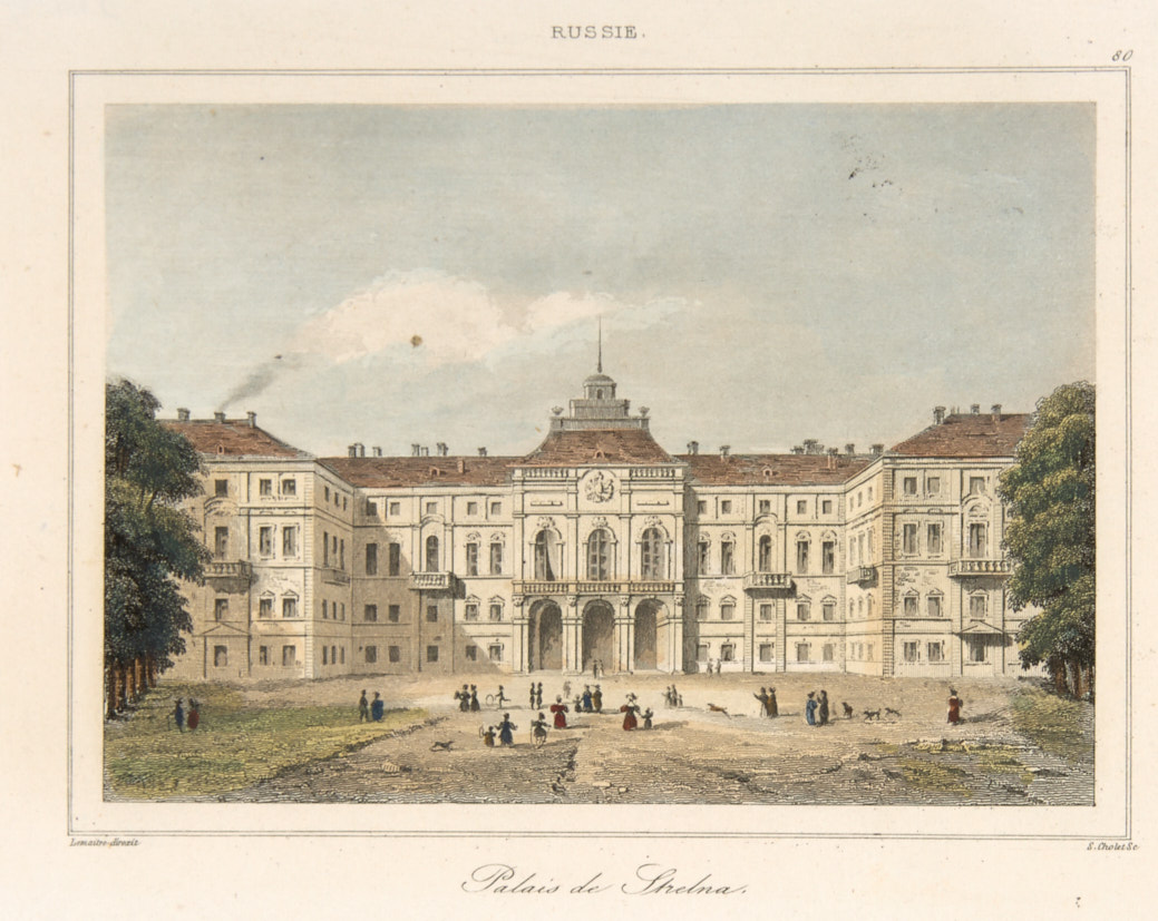 Большой (Константиновский) дворец в Стрельне. 1838 г. Офорт, резец, акварель, 13×21 см.