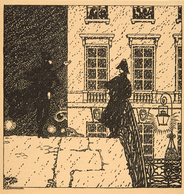 Пробный отпечаток. Опубликовано в журнале «Аполлон» в 1909 г. Смонтировано на ватман. Ранее в собрании А. В. Улитина. Слева внизу печатная подпись М. Добужинский.