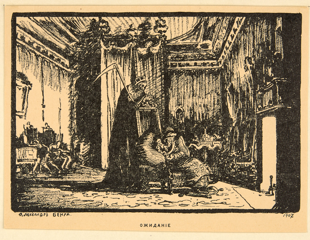 2. Ожидание. Цинкография, 14,5×19,7 см. Под изображением печатная авторская подпись и дата: Александр Бенуа 1907.