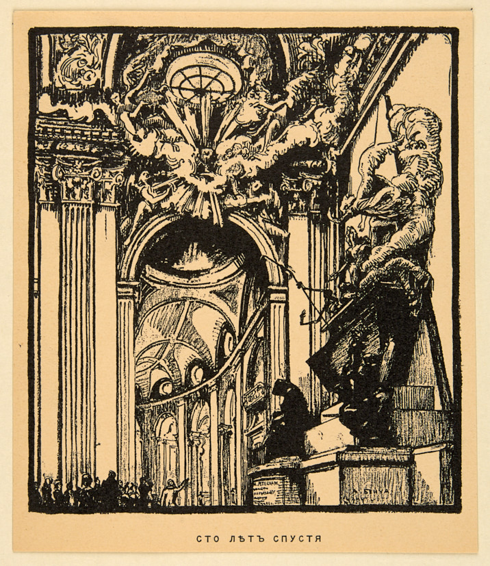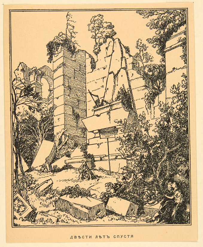 2. Двести лет спустя. Цинкография, 17,4×13,7 см. Слева внизу печатная авторская подпись: А. Бенуа. Смонтировано на лист ватмана.