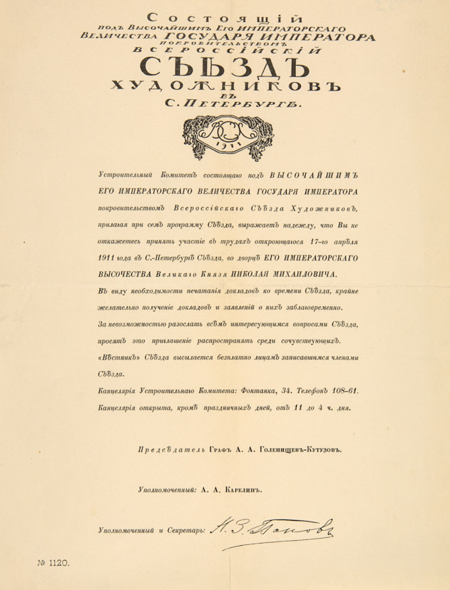 Приглашение к участию в трудах Всероссийского съезда художников в Санкт-Петербурге. Апрель 1911 г. Цинкография, полиграфическая печать, 29×22,3 см.