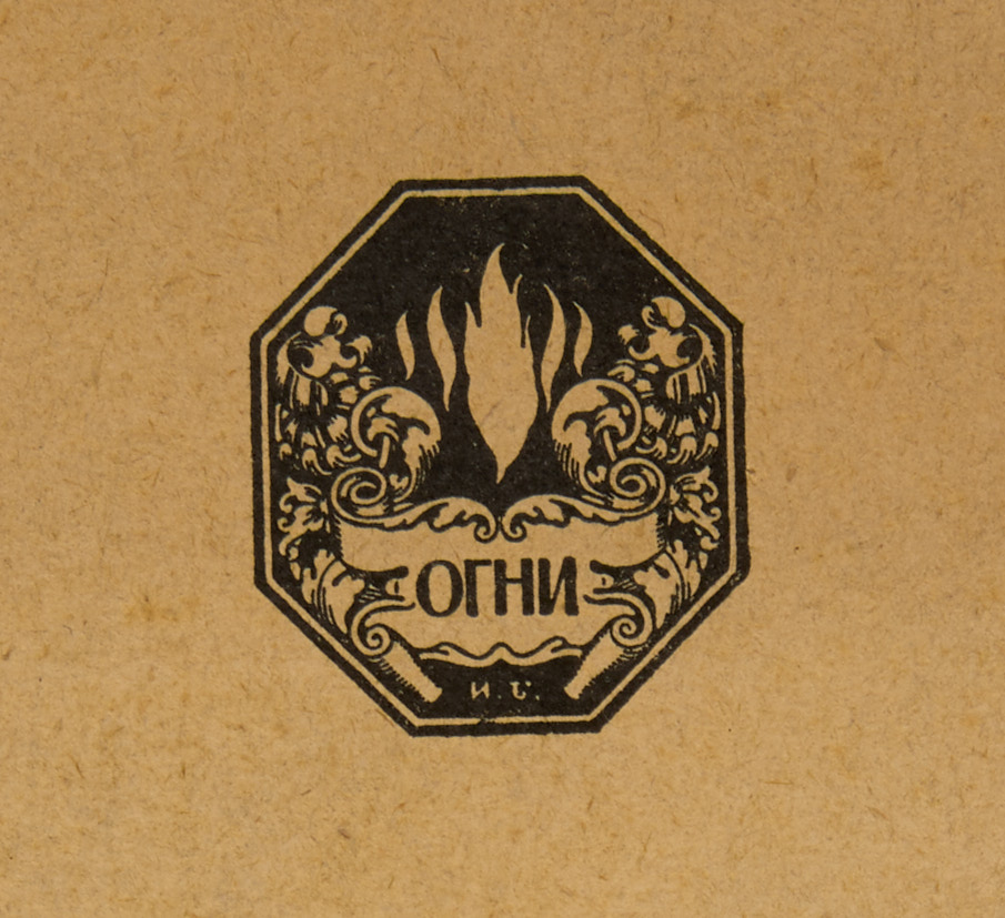 2. Марка Издательства «Огни» 1908 г. Цинкография, 7,8×7,7 см. В центре внизу авторская монограмма. Смонтировано на листы ватмана.