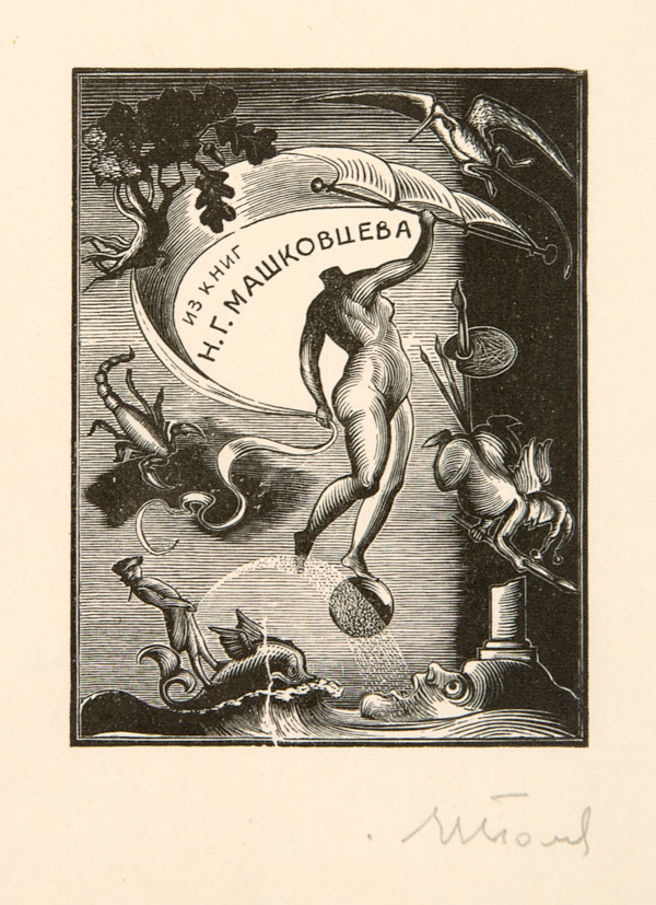 Лот из 5 пробных отпечатков экслибрисов П. Корнилова, Панфилова, н. Машковцева. 1960-е гг. Ксилографии, 16×9,5; 10,5×7см.