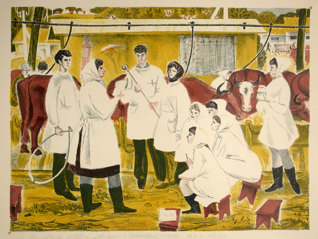 Студенты в коровнике. Пробный отпечаток. 1972 г. Цветная автолитография, 60×86 см.