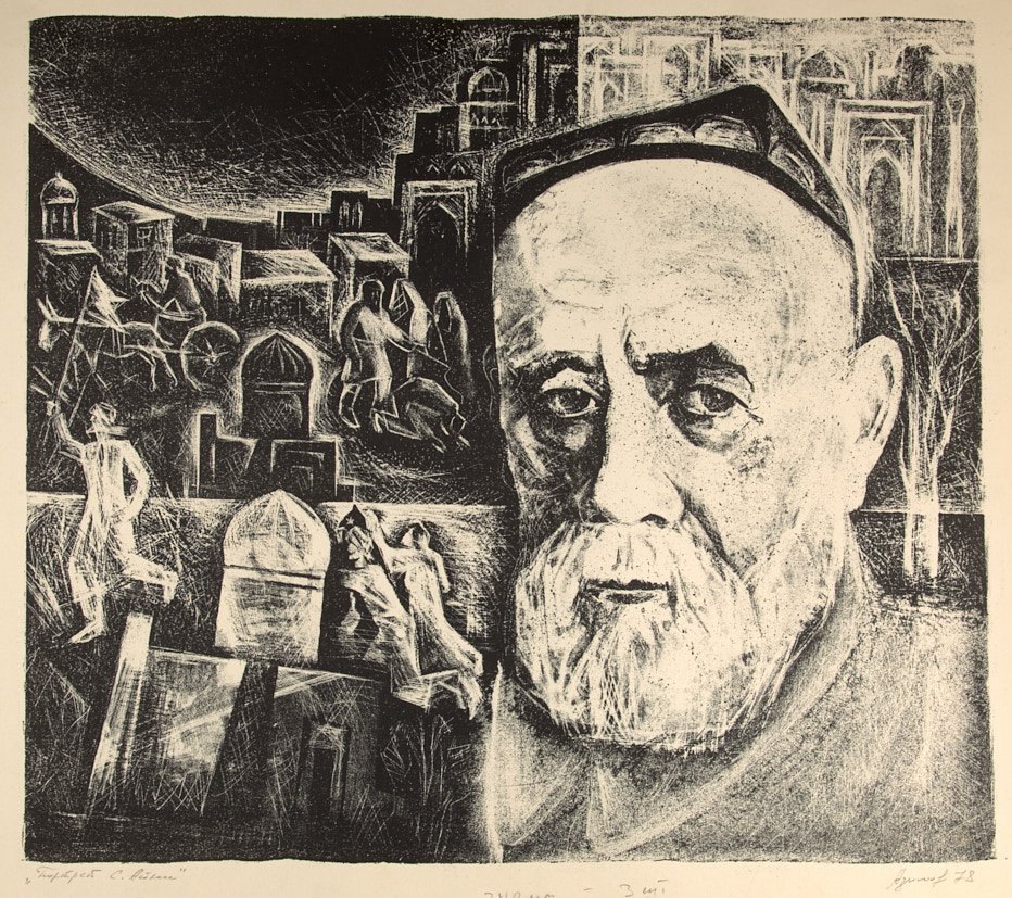 Портрет писателя Садриддина Айни на фоне старого Самарканда. 1978 г. Автолитография, 50,5×58 см.