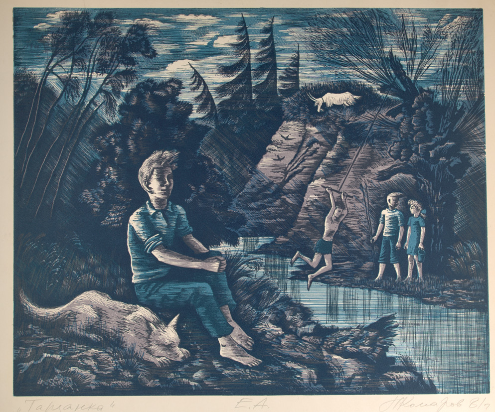 Тарзанка. 1981 г. Цветная линогравюра, 55×65 см.