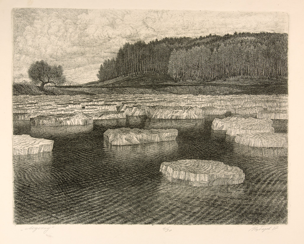 Ледоход. 1987 г. Офорт, Д: 30×37; Д: 47×53 см.