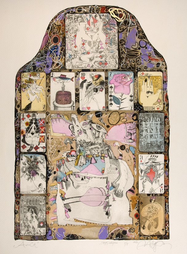 Пасьянс «Алиса». 2012 г. Офорт, гуашь, 67×51,5 см.