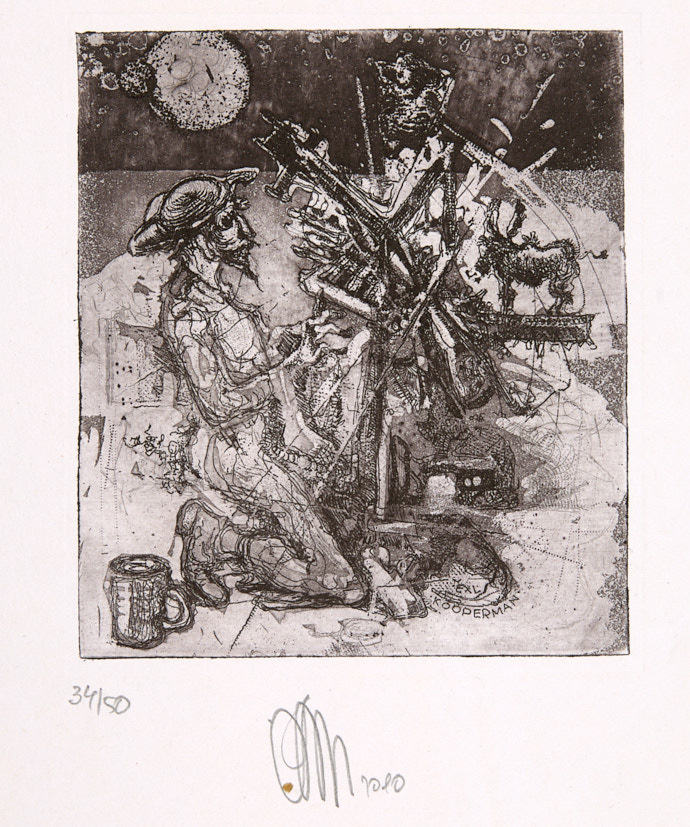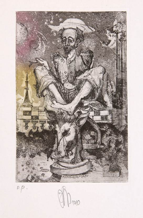 Лот из 2 иллюстраций к роману Сервантеса «Дон Кихот» 2000-е гг. 1. На шахматной доске. Офорт, акватинта акварель, 24,5×16,3 см.