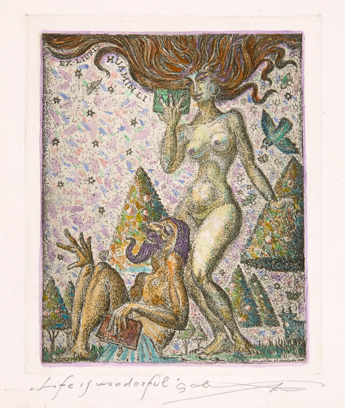 Жизнь прекрасна. Экслибрис Хуамин Ли. 2000-е гг. Офорт, акварель, 19,4×16,3 см.