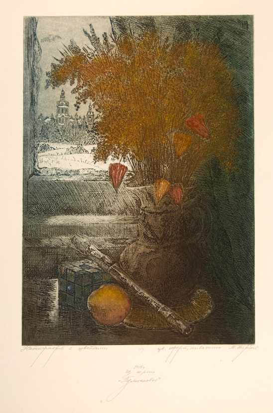 Натюрморт с флейтой и цветами. Из серии «Подмосковье». 1988 г. Цв. офорт, акватинта, гуашь, белила, 58,5×44 см.
