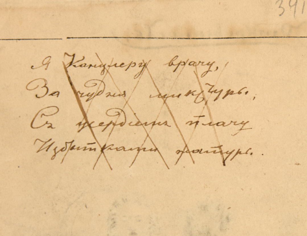 Справа по центру внизу авторская монограмма пером. Под изображением авторский текст. Над изображением по центру авторская подпись и название пером. На обороте авторское четверостишие пером: я канцлеру врачу за чудные микстуры с усердием плачу избытками натуры.