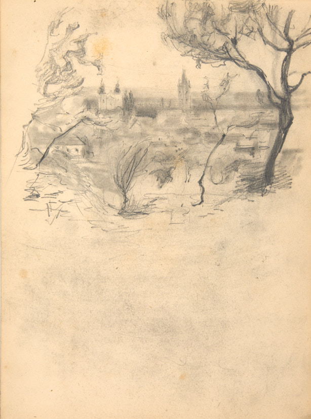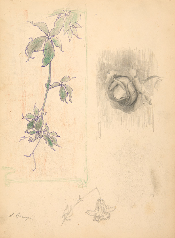 На обороте набросок бутона розы и зеленого побега и надпись: N Banya. [1899-1900]. Лист из альбома М. Добужинского 1899-1900 гг., который художник начал в городе Олита (Алитус) Литва, продолжил в поездке к матери в Тамбовской области, далее в Мюнхене и Надьбане (Nady Banya) где учился у Ш. Халоши.