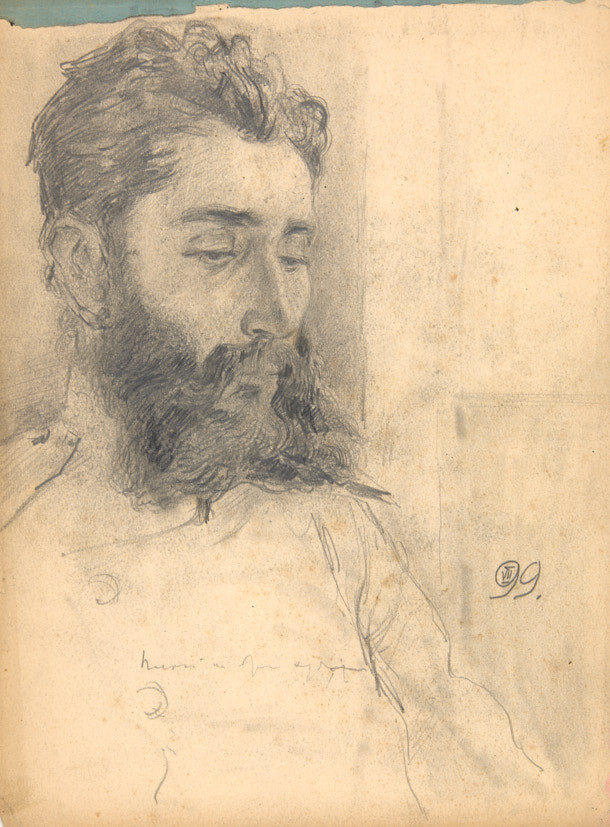 Под изображением неразборчивый авторский текст карандашом. Справа внизу авторская дата: VII 99. Лист из альбома М. Добужинского 1899-1900 гг., который художник начал в городе Олита (Алитус) Литва, продолжил в поездке к матери в Тамбовской области, далее в Мюнхене и Надьбане (Nady Banya) где учился у Ш. Халоши.