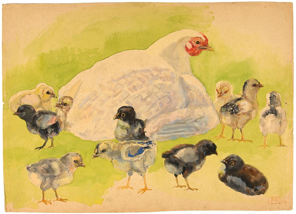 Наседка с цыплятами. Вариант живописного полотна. 1934 г. Акварель, кисть, 24×34 см.