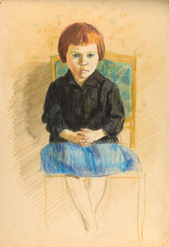 Девочка на стуле. Первая половина 1930-х гг. Карандаш, цветные карандаши, пастель, 41,5×29,5 см.