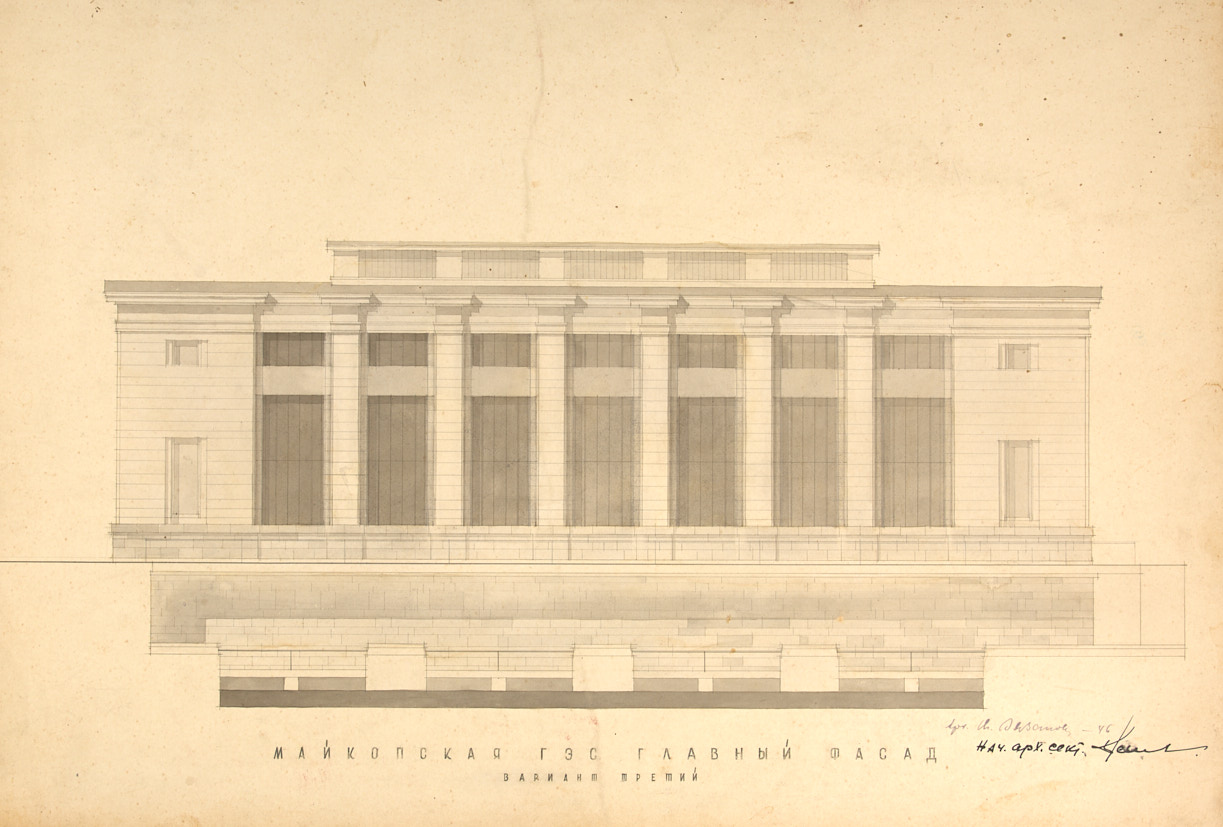 Эскиз главного фасада Майкопской ГЭС. 1946 г. Картон, карандаш, акварель, размывка, 34,5×50 см.