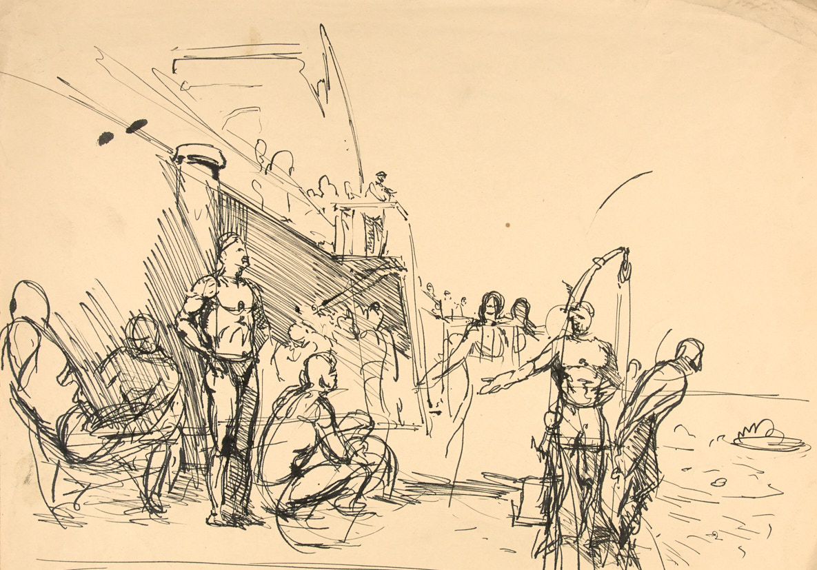 Купание команды на линкоре «Севастополь». 1950-е гг. Тушь, перо, 28,5×38 см.