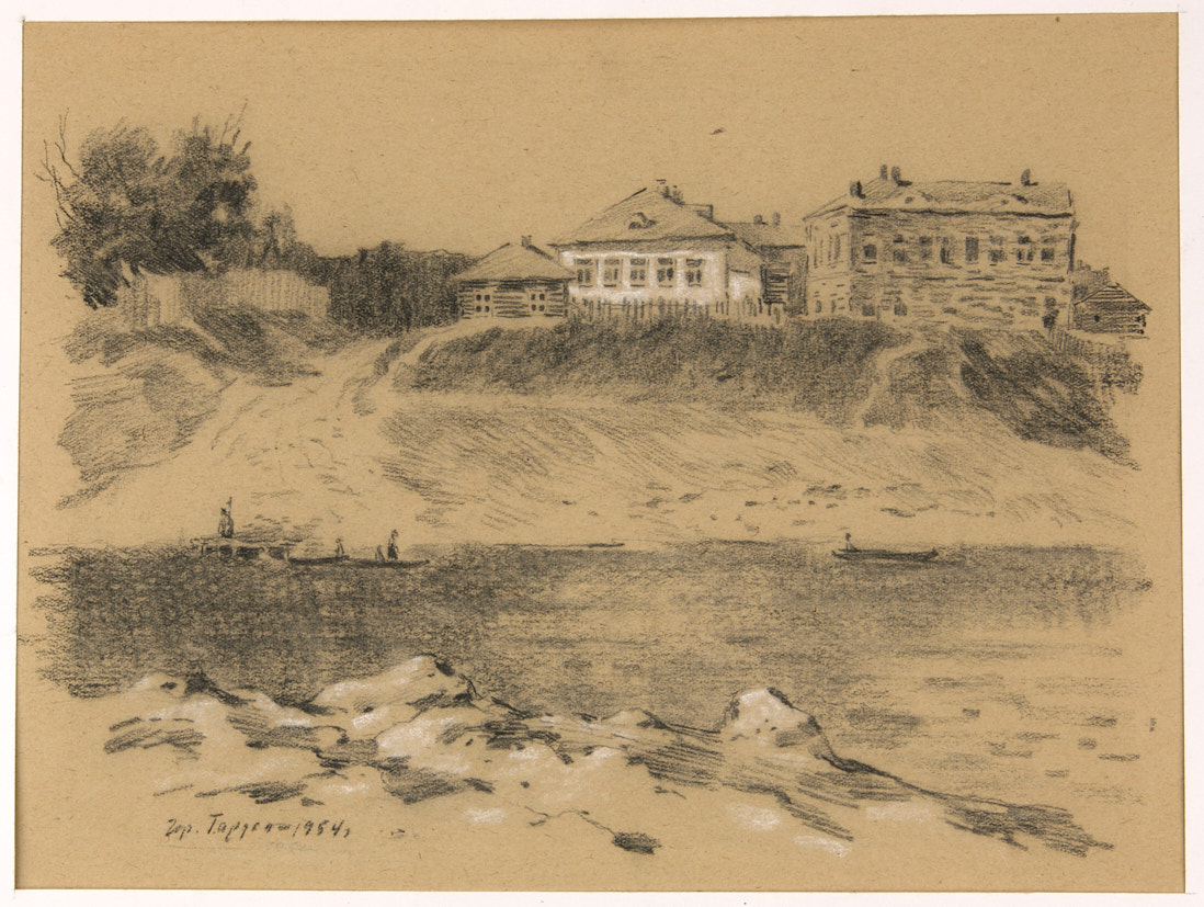 Вид города Тарусы. 1954 г. Бумага, уголь, белила, 29,5×32,7 см.