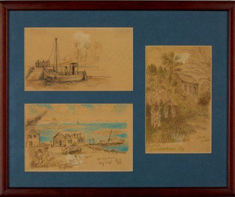 Лот из 3 рисунков на одном паспарту в раме. 1. Кораблик у пристани. 1955 г. Бумага, карандаш, цв. карандаши, 10×16 см.
