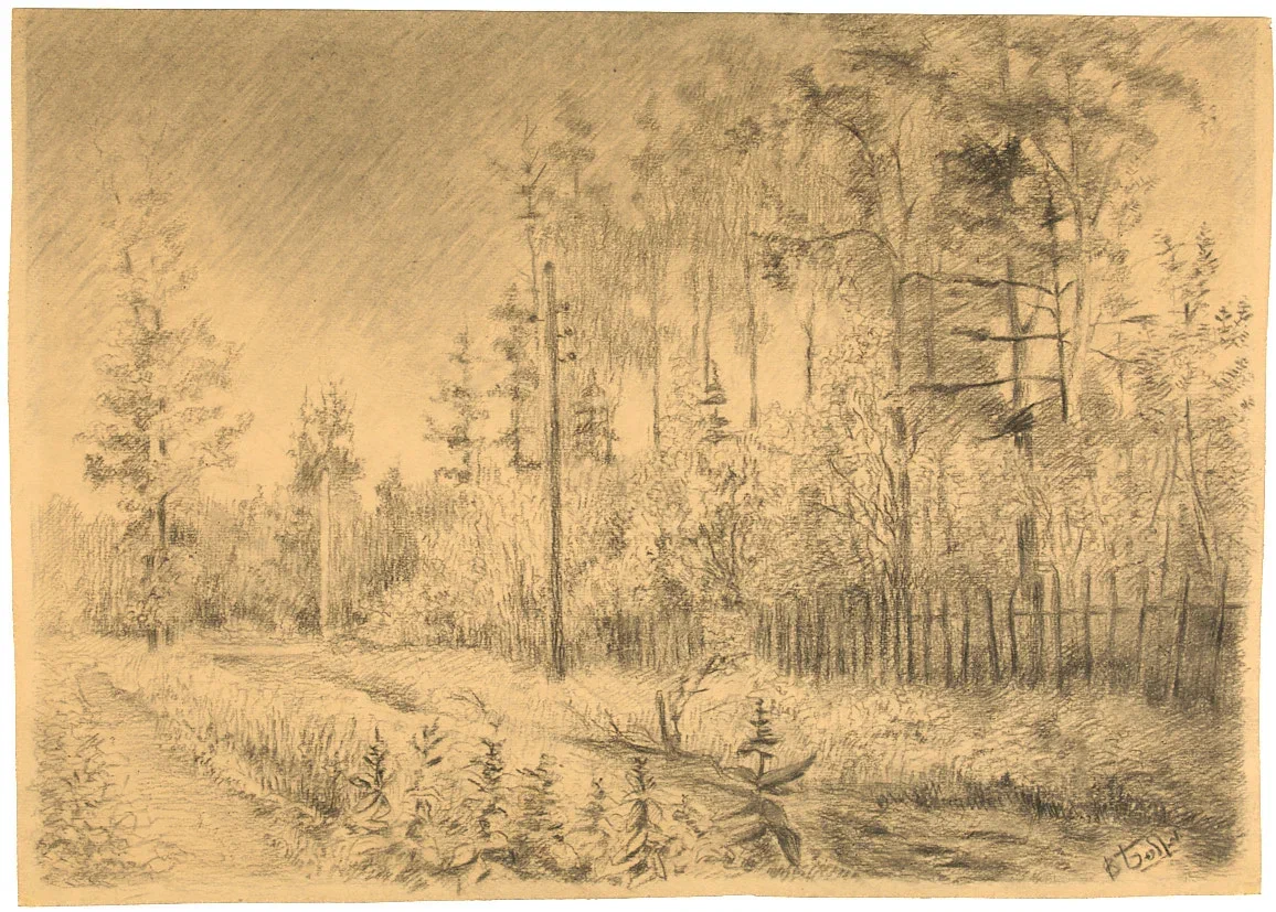 Пейзаж с телеграфными столбами. 1960-е гг. Акварельная бумага, итальянский карандаш, 27×37,5 см.