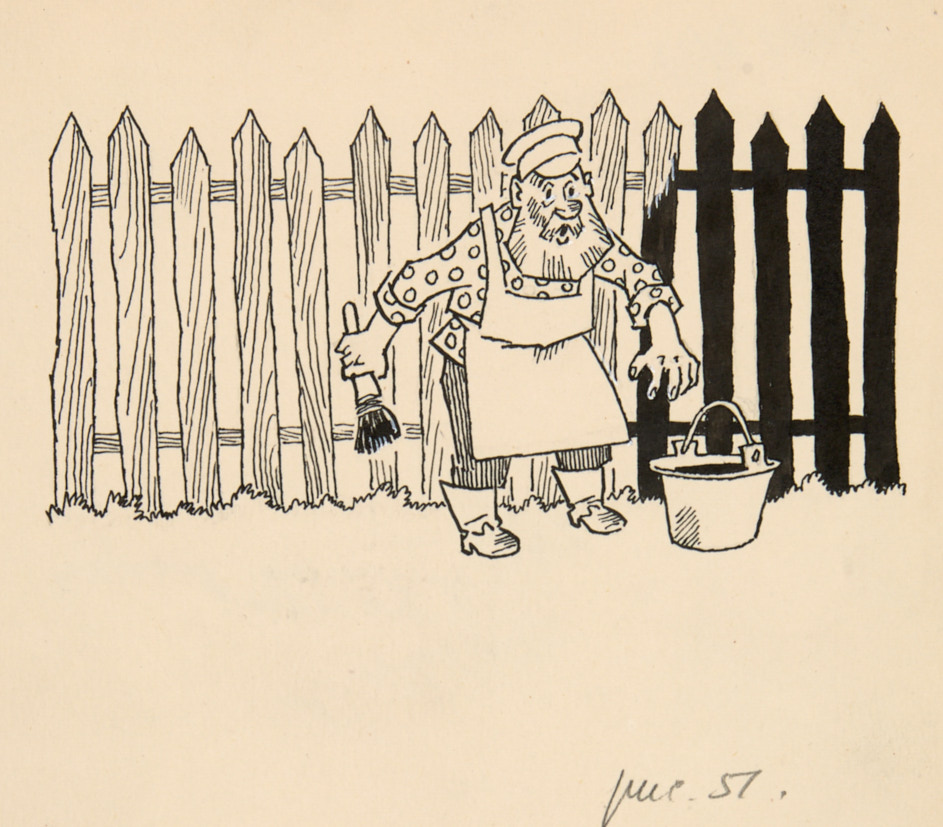 Дворник у забора. Иллюстрация к сказке Г. Курлата «Золотая рыбка». 1960-е гг. Тушь, перо, 20,6×15 см.
