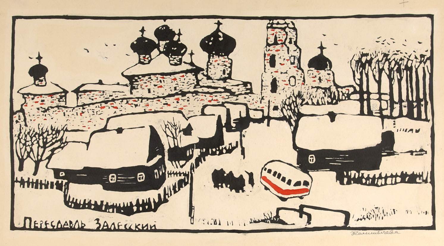 Старый Переславль Залесский. 1960-е гг. Ватман, линогравюра, кисть, гуашь, 33×48 см.