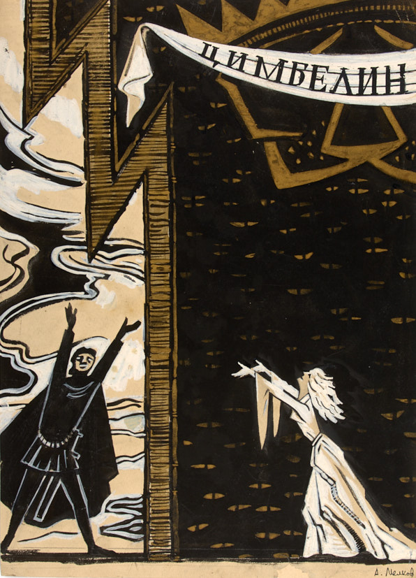 Эскиз театральной декорации к пьесе У. Шекспира «Цимбелин» для театра им. Ленсовета. 1960-е гг. Бумага, кисть, тушь, белила, бронзовая краска, 43×30,9 см.