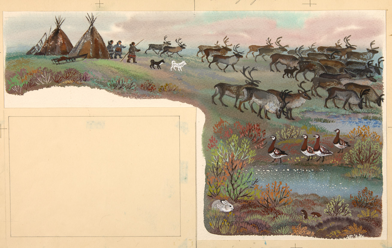 Оленеводы. Иллюстрация к книге Н. И. Сладкова «Разноцветная Земля». 1960-е гг. Бумага, гуашь, белила, кисть, 24×38 см.