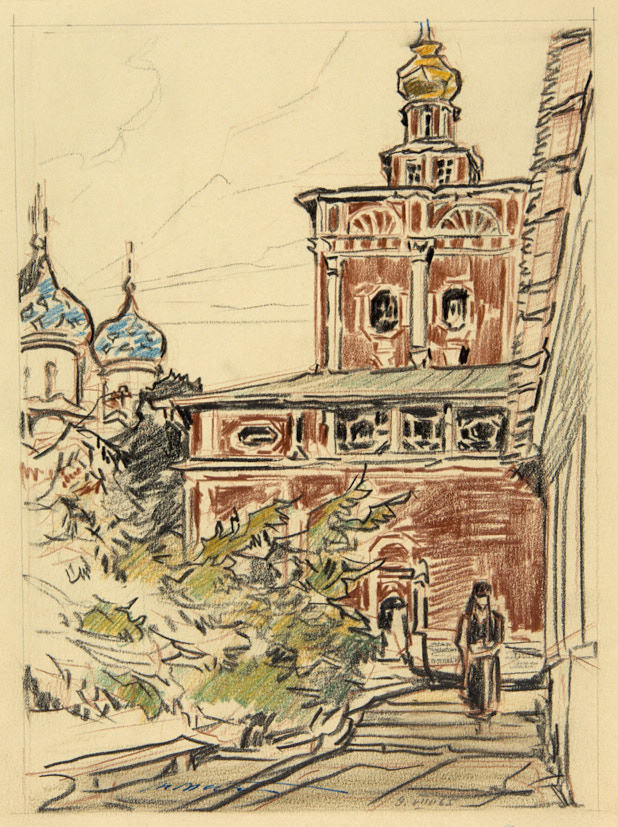 Надвратная церковь Иоанна Предтечи в Троице-Сергиевой Лавре. 1965 г. Акварельная бумага, цанговый карандаш, цветные карандаши, 27×20,3 см.