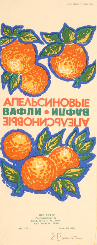 На оборотах паспарту штампы кондитерской фабрики и утверждающие надписи. Приложен пробный отпечаток для упаковки для вафель апельсиновых, утвержденный автором.