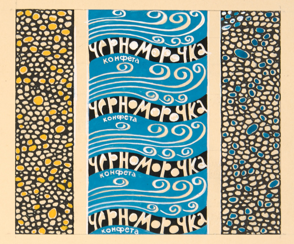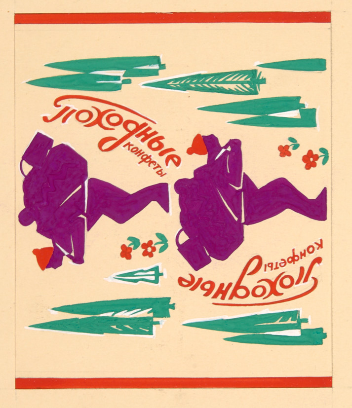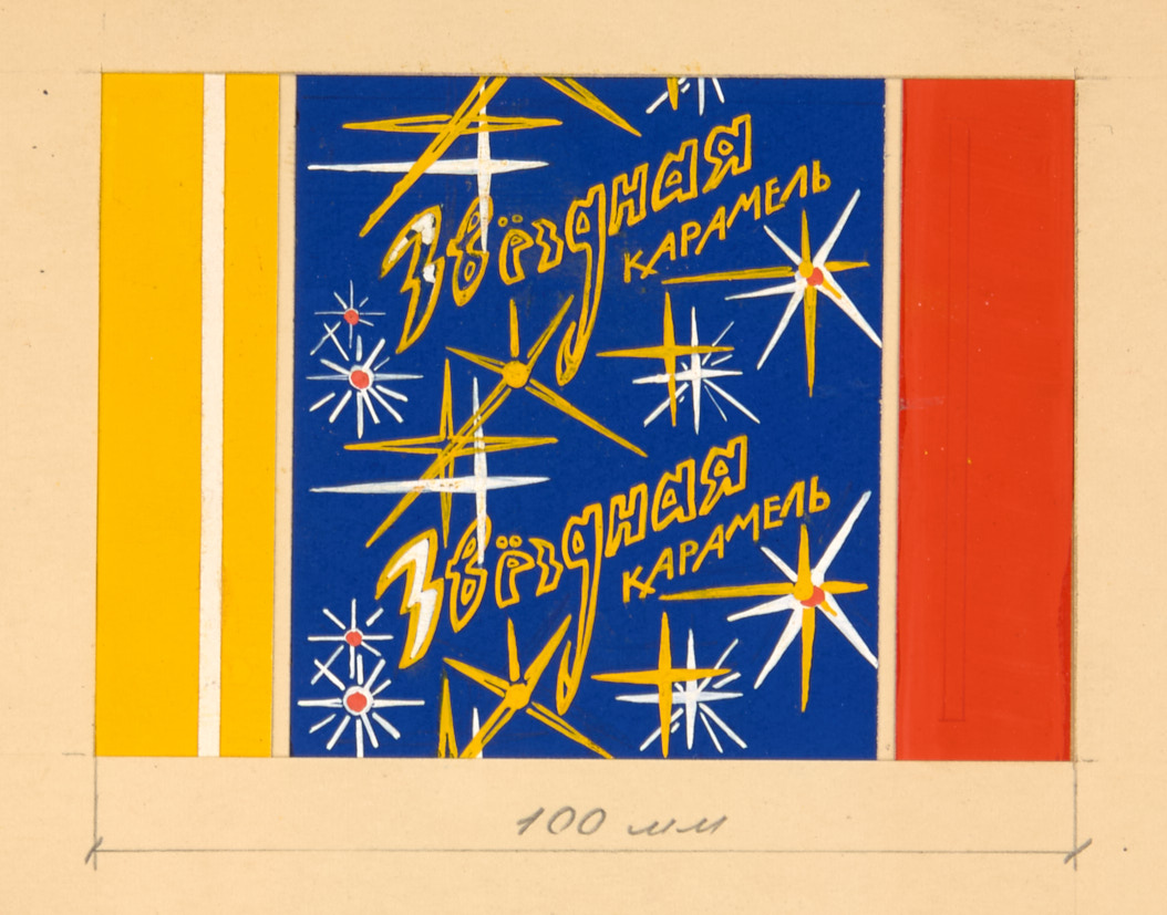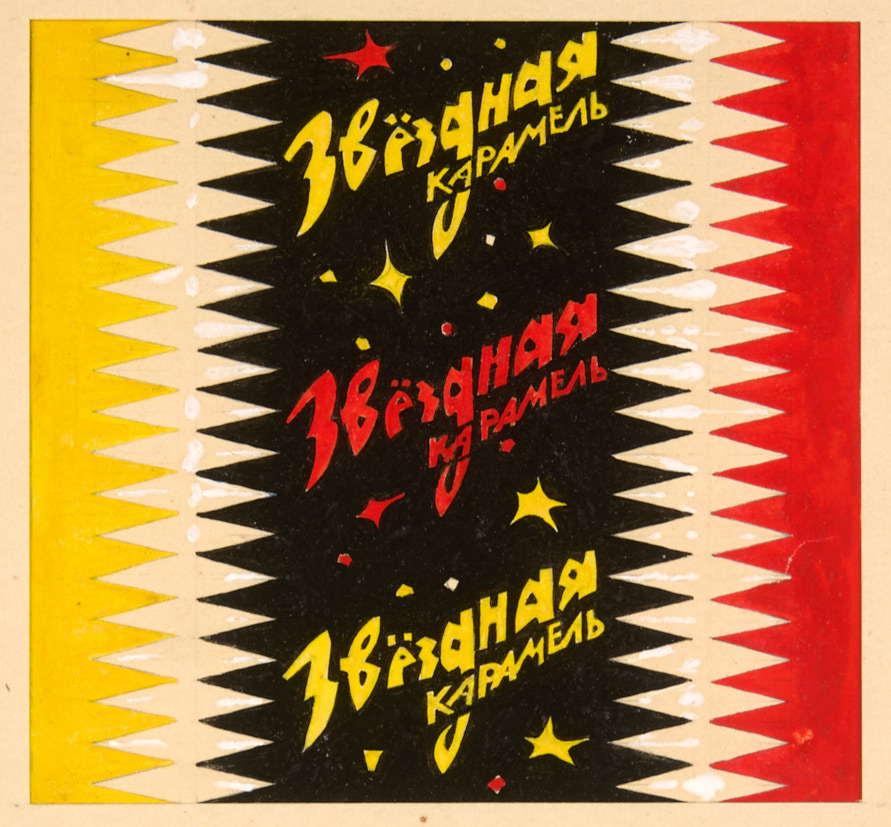 Лот из 4 оригиналов промграфики: эскизов обертки для конфет кондитерской фабрики Нижнего Тагила: «Звездная карамель», «Походные», «Звездная карамель», »Черноморочка». 1968-1969 гг. Бумага, гуашь, 11,5×9,6 см.
