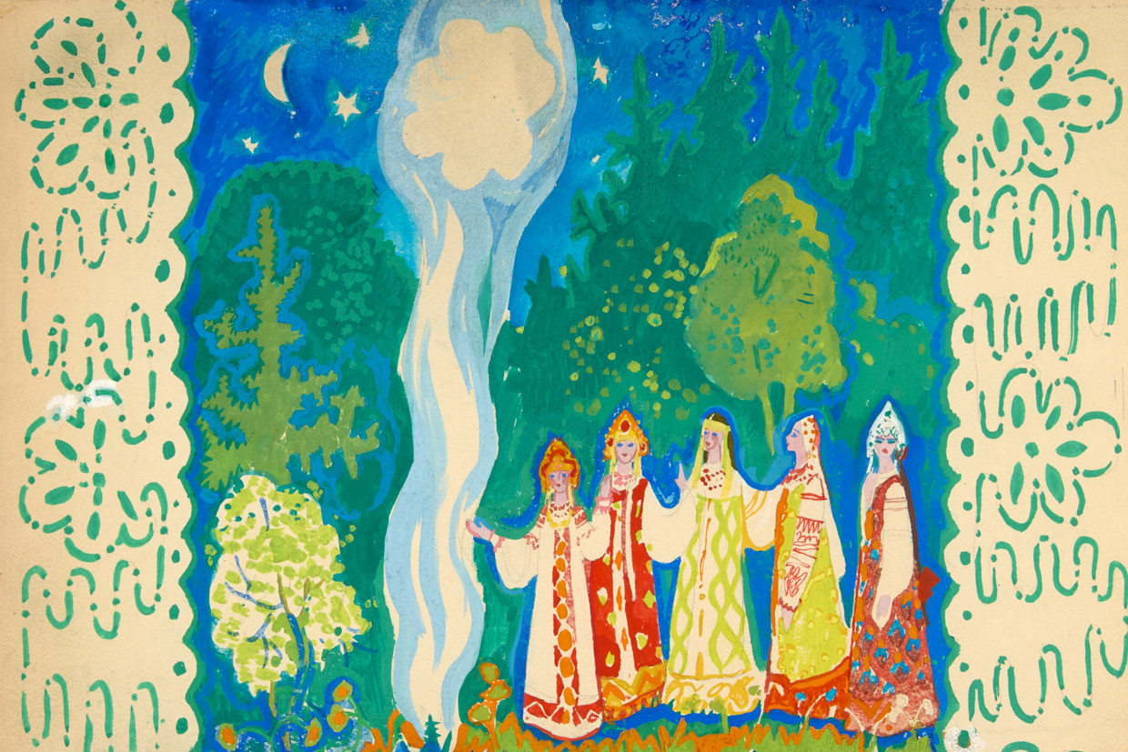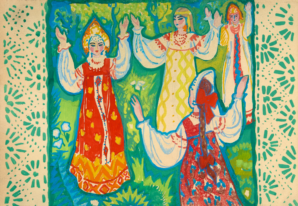 Хоровод. Растаяла. Лот из двух оригиналов иллюстраций к сказке А. Н. Островского «Снегурочка». 1969 г. Акварельная бумага, гуашь, кисть, 22×33 см.