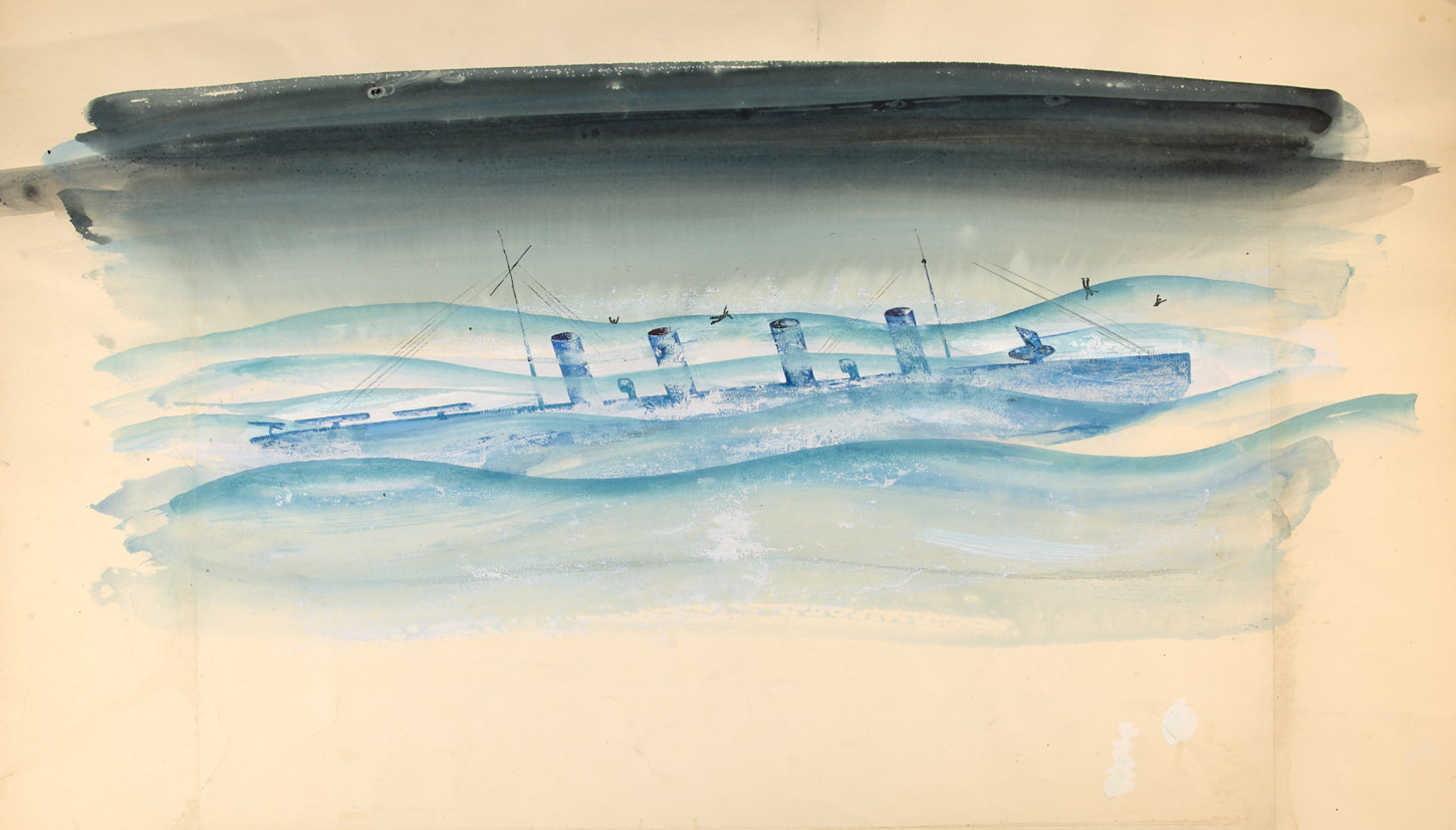 Подводная лодка. Иллюстрация к книге Сахарнова «Удивительные корабли». 1960-е гг. Бумага, гуашь, тушь, кисть, 43×50,5 см.