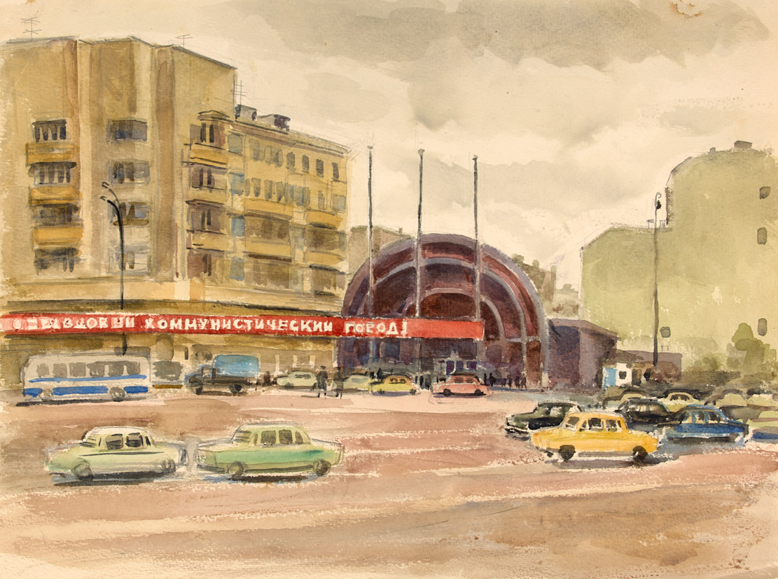 Москва. Садовое кольцо. Метро «Красные ворота». 1979 г. Бумага, карандаш, акварель, 36×48 см.