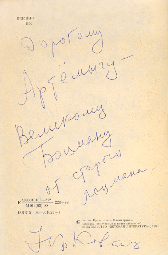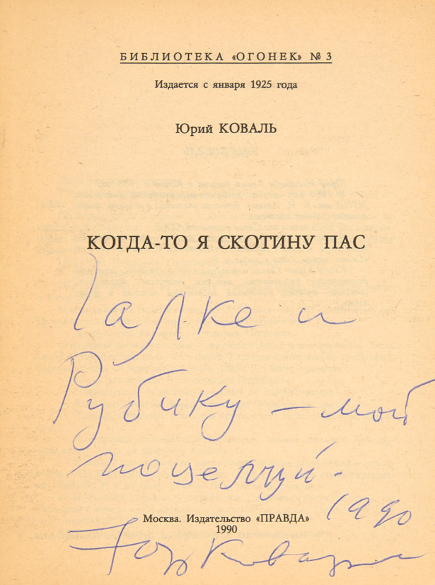 1. Коваль Ю. [Автограф] Когда-то я скотину пас. М.: Изд-во «Правда», 1990. 46 [2] c.